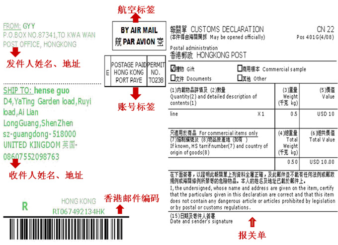 賬號標貼+報關單+收件人姓名、地址+香港郵件編號+航空標貼: